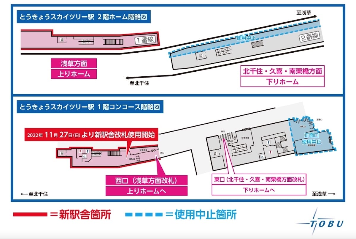 構内のデザインも大きく変化。白を基調とした明るい内装に、スカイツリーを意識したライン照明や金属パネルが組み合わされ、未来的で清潔感のある雰囲気になりました。壁面にはスカイツリー周辺のイラストや地図が掲示され、観光案内の役割も果たしています。