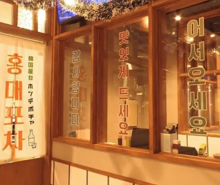 ホンデポチャの最大の魅力は、何といってもその再現度の高い「韓国屋台風」の内装です。赤や黄色のネオン、韓国語のポスター、ビニールテーブルクロスにスチール製の丸イスといった装飾が並び、まるで弘大(ホンデ)の路地裏にある居酒屋に入り込んだかのような感覚に。韓国の音楽が流れるなか、仲間とワイワイ過ごせる空間は、写真映えも抜群。女子会やカジュアルな飲み会にも最適です。カウンター席もあるため、一人でも気兼ねなく楽しめるのもポイントです。