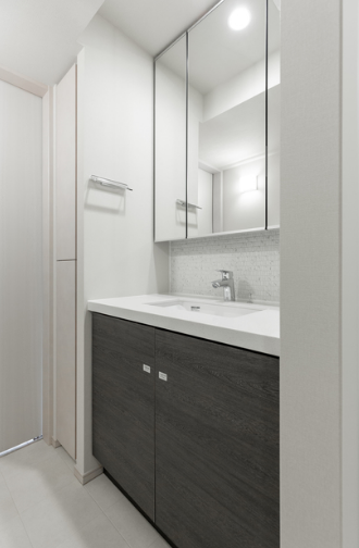 独立洗面台は、洗面スペースが浴室やトイレと分かれているタイプの洗面設備で、使い勝手の良さが魅力です。朝の身支度や帰宅後の手洗いなど、他の水回りを使用中でも気兼ねなく使えるため、家族の多い世帯にもおすすめです。収納力のあるキャビネット付きのタイプが多く、化粧品や洗面用具をすっきりと整理できます。また、大きめの鏡や照明が備わっているため、メイクや髪のセットなどの身だしなみにも便利です。洗面所としての独立性が高いことで生活動線もスムーズになり、快適で清潔感のある暮らしをサポートしてくれます。