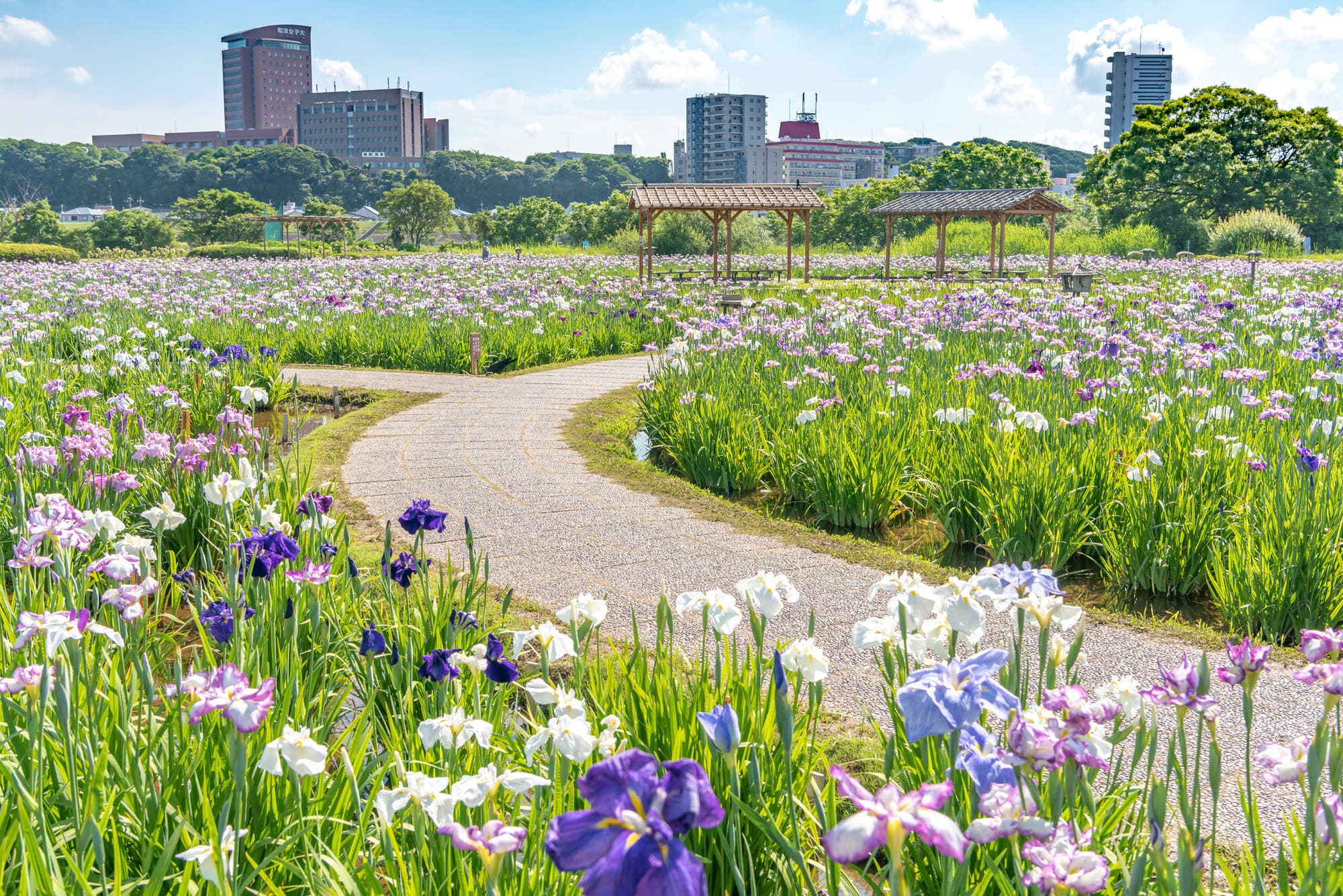 小岩菖蒲園は、約5万本もの花菖蒲が咲き誇る都内有数の名所です。園内には多彩な品種が植えられており、梅雨の季節になると紫や白、黄色など色鮮やかな花が一斉に咲き、訪れる人々を楽しませてくれます。紫陽花などの季節の花も見られるため、初夏の自然美を存分に味わえるスポットです。